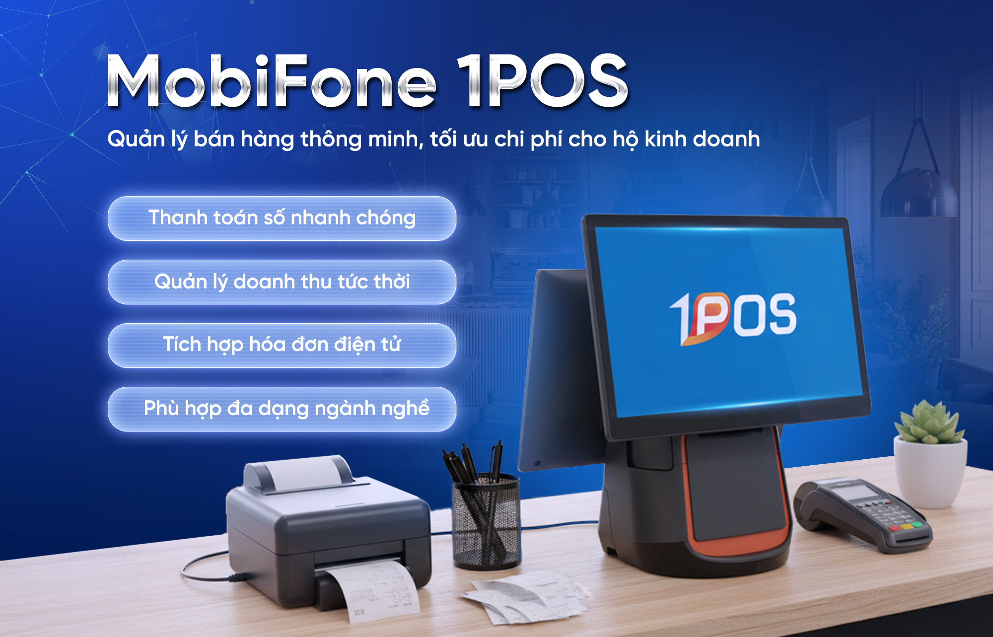 Trong làn sóng chuyển đổi số mạnh mẽ, thanh toán hiện đại đang trở thành tiêu chuẩn mới của kinh doanh thông minh. Thấu hiểu nhu cầu đó, MobiFone giới thiệu giải pháp MobiFone 1POS - thiết bị bán hàng “tất cả trong một”, giúp chủ cửa hàng dễ dàng thanh toán không tiền mặt, quản lý doanh thu, in hóa đơn và theo dõi hoạt động kinh doanh chỉ trên một thiết bị duy nhất.