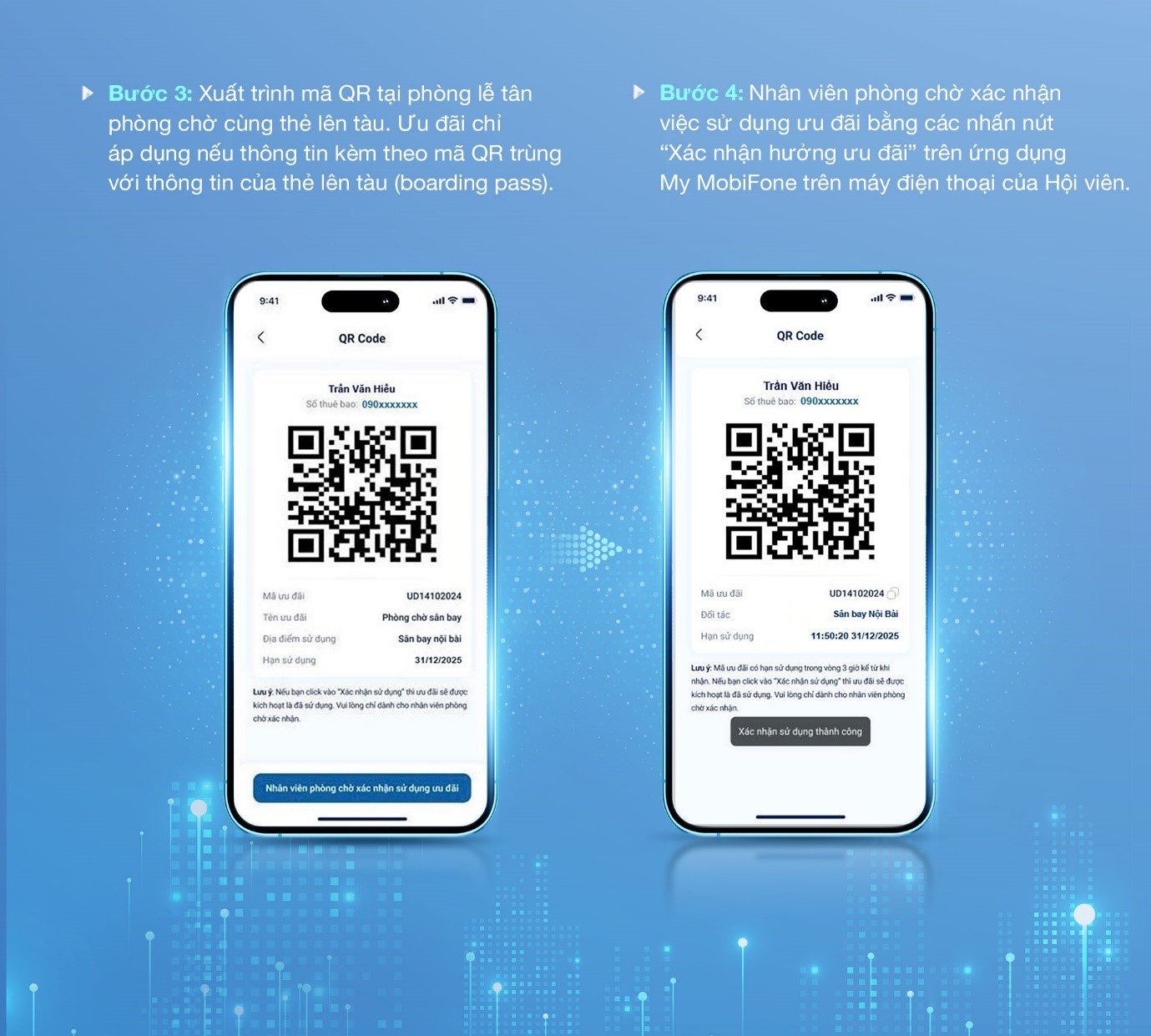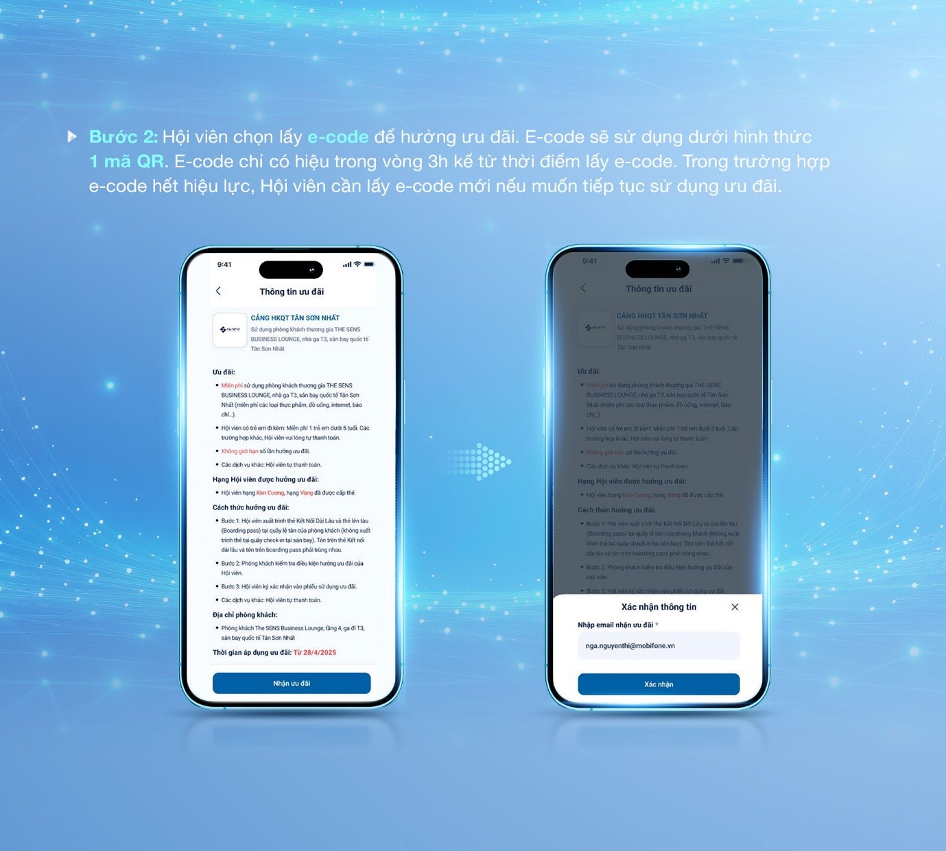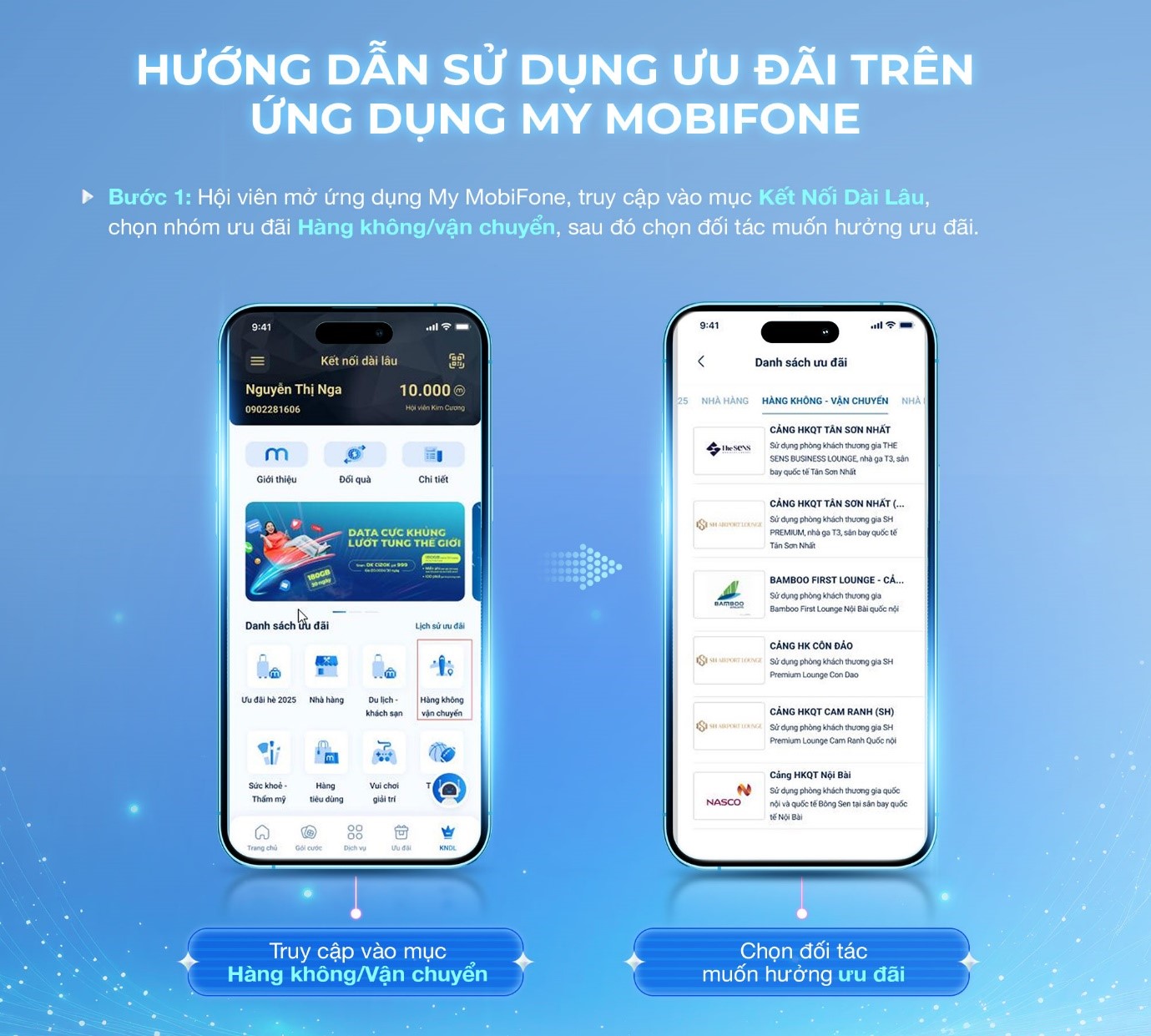 Tiếp nối hành trình chuyển đổi số mạnh mẽ, MobiFone không chỉ tiên phong số hóa toàn bộ dịch vụ của mình mà còn mở rộng tiện ích tới hệ sinh thái đối tác liên kết, nhằm mang đến sự tiện lợi tối đa cho khách hàng. Giờ đây, chỉ vài thao tác trên ứng dụng My MobiFone, Hội viên Kết Nối Dài Lâu có thể dễ dàng bước vào phòng chờ thương gia tại các sân bay trên toàn quốc, tận hưởng khoảnh khắc thư giãn trong không gian sang trọng và tiện nghi. Không còn thời gian chờ đợi với thủ tục giấy tờ, mỗi phút giây của Hội viên từ nay đều được nâng niu trọn vẹn!