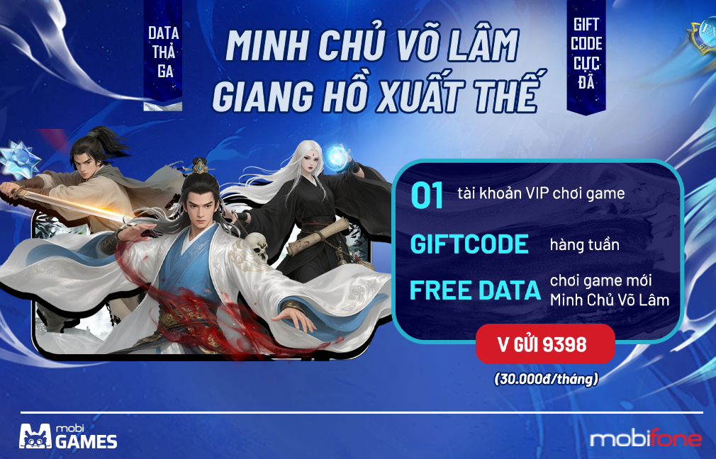 Ngày 08/01/2026, siêu phẩm "Minh Chủ Võ Lâm" - tựa game hợp tác với Vplay chính thức mở cửa đón game thủ. Nhân dịp này, MobiGames tung gói cước độc quyền chỉ 30.000đ/tháng: Miễn phí 100% dung lượng data tốc độ cao khi chơi game, tặng kèm Tài khoản VIP và Giftcode giá trị hàng tuần.