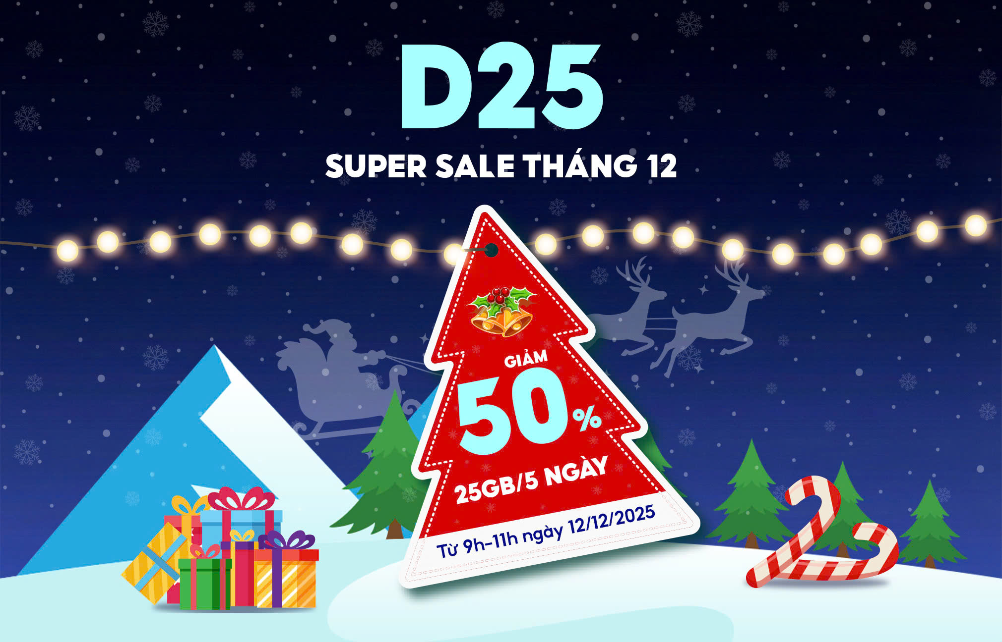 Mùa lễ hội cuối năm đã gõ cửa, và MobiFone mang đến món quà “data siêu to khổng lồ” dành cho tất cả khách hàng với chương trình SUPER SALE THÁNG 12. Chỉ duy nhất trong khung giờ vàng 9h–11h ngày 12/12/2025, gói cước D25 được GIẢM 50%, từ 25.000đ chỉ còn 12.500đ nhưng dung lượng vẫn giữ nguyên 25GB/5 ngày – ưu đãi cực hời cho những ai muốn lướt mạng thả ga mà vẫn tiết kiệm chi phí. Đây là cơ hội vàng để bạn “nạp năng lượng data” cho mùa lễ hội, xem phim – chơi game – lướt mạng mượt mà suốt cả tuần.